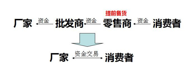 传统商业活动:资金流动在厂家——各级批发商——零售商——消费者的各个环节中,商铺需提前用自己的资金进货备货,消费者才可以从店铺购买到商品,